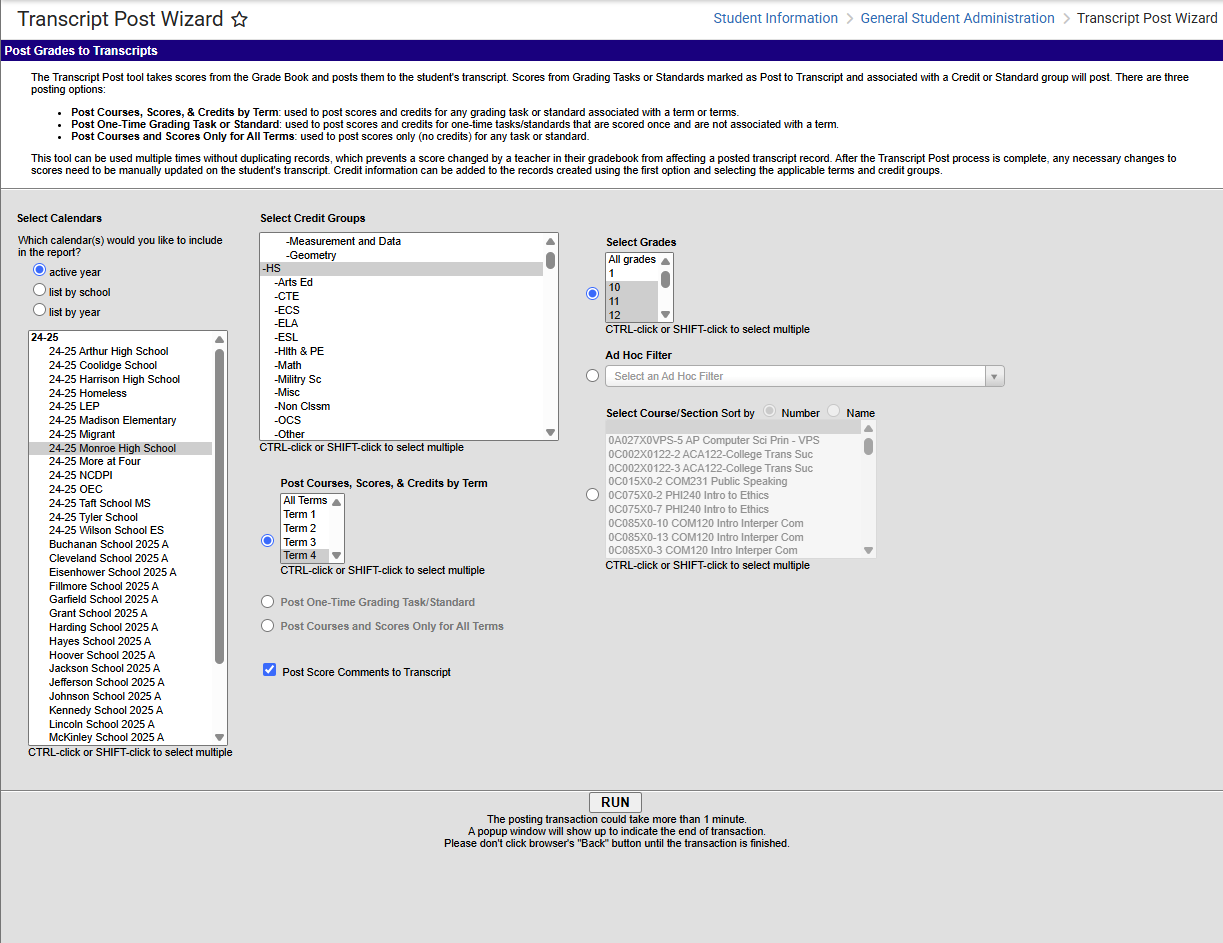 - Posting transcript grades can be done multiple times without duplicating or overwriting existing transcript records. Only new transcript grades will be added.