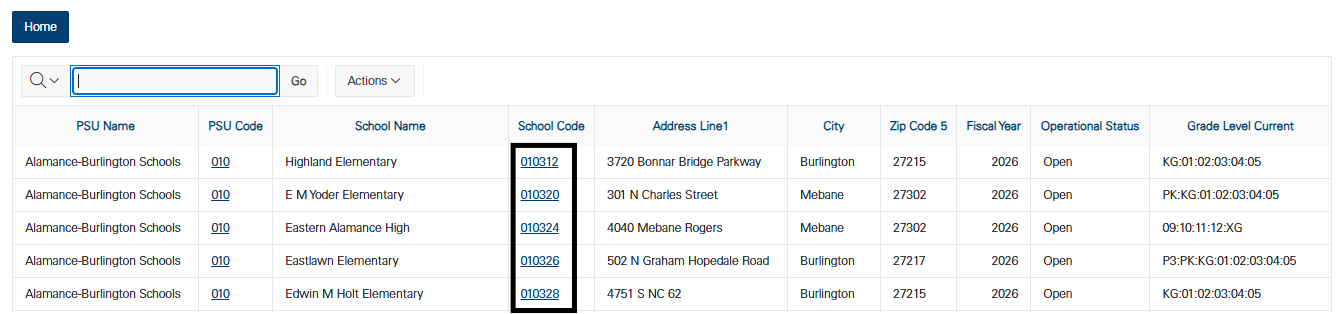 - Click the appropriate school number under the School Code column.